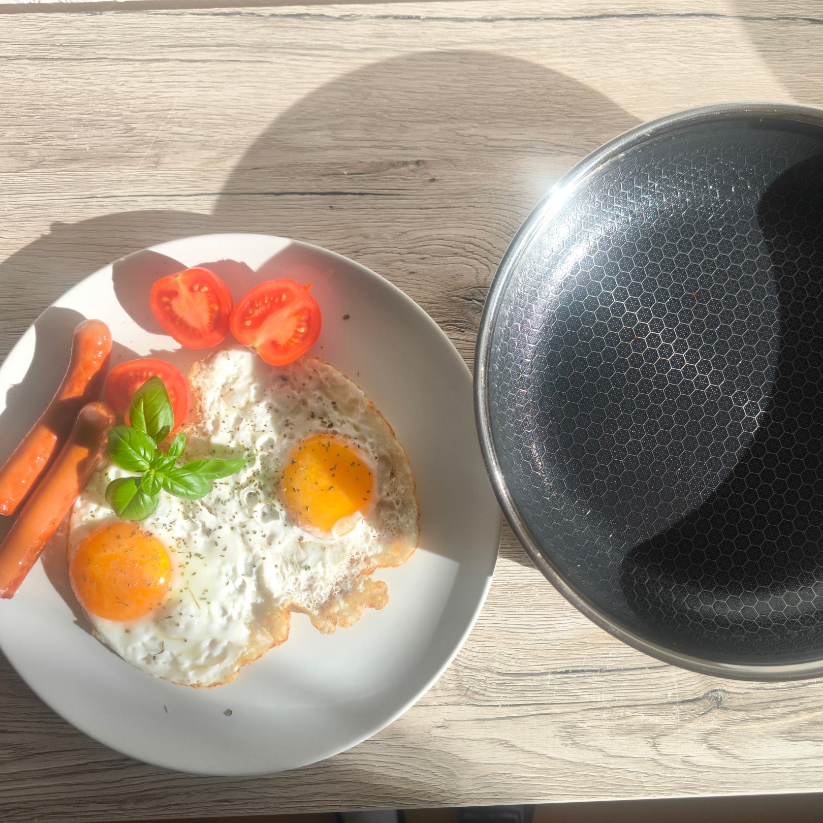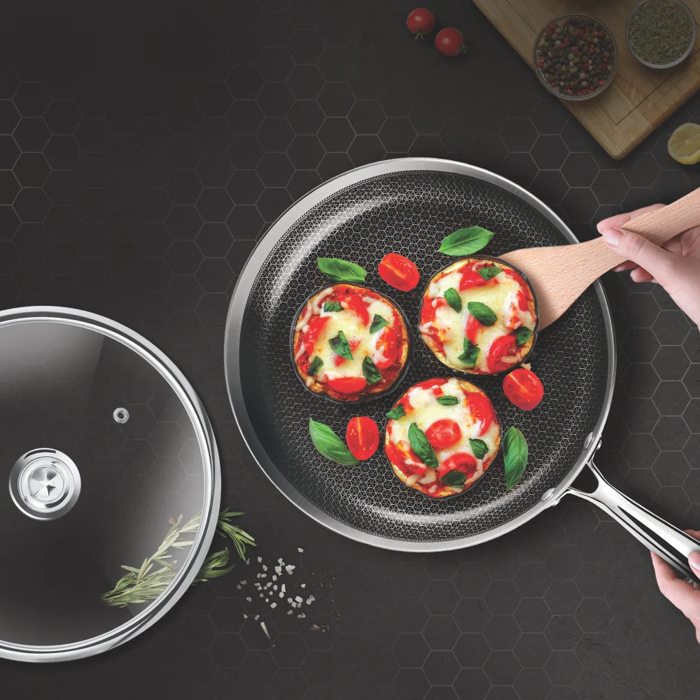 Unsere Pfannen bestehen aus hochwertigem 304 Edelstahl mit einer PFOA-freien Antihaftbeschichtung und einer lasergravierten Wabenstruktur für bessere Performance.