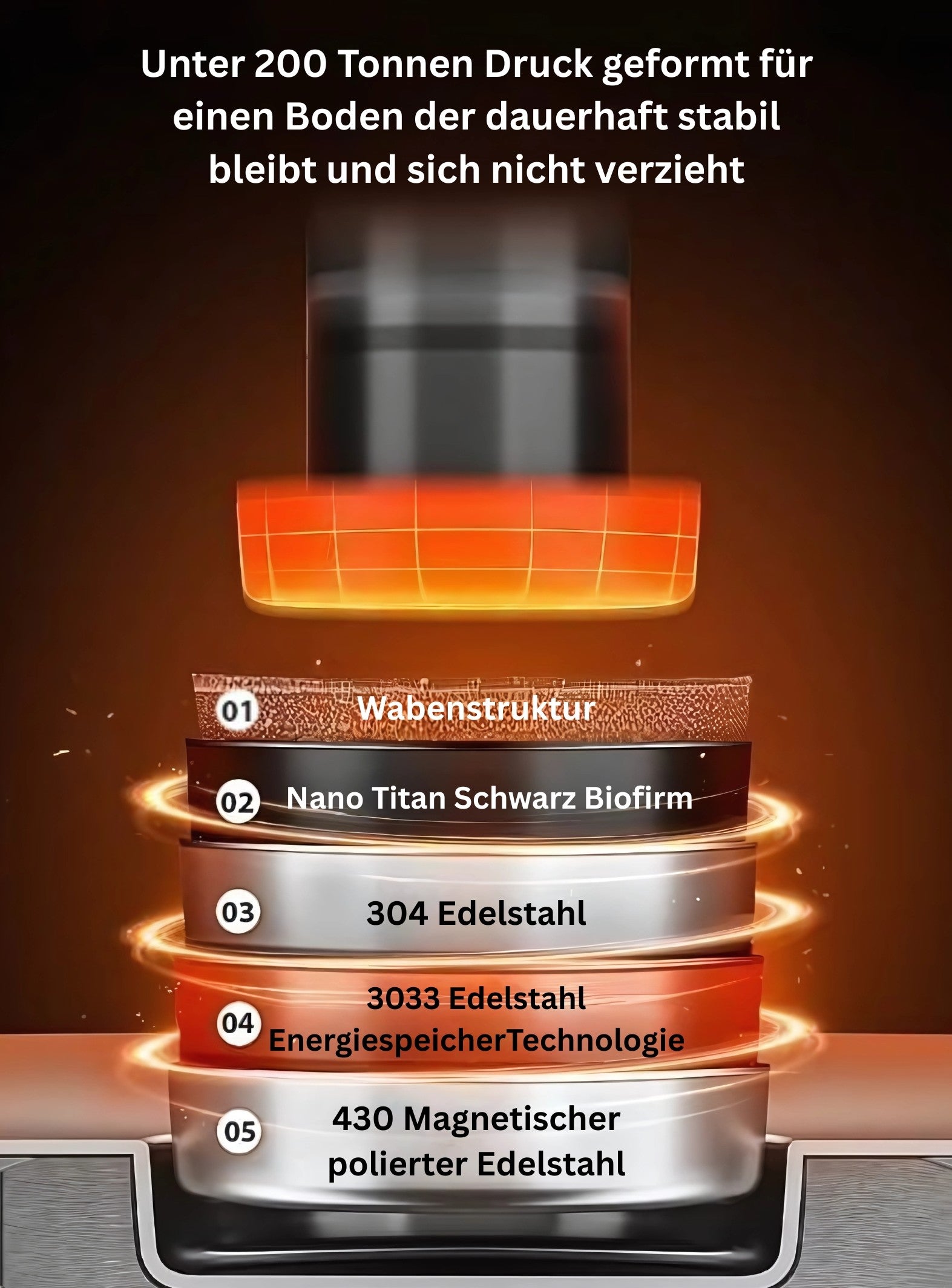 Hochwertiger 304 Edelstahl sorgt für Robustheit und gleichmäßige Wärmeverteilung.